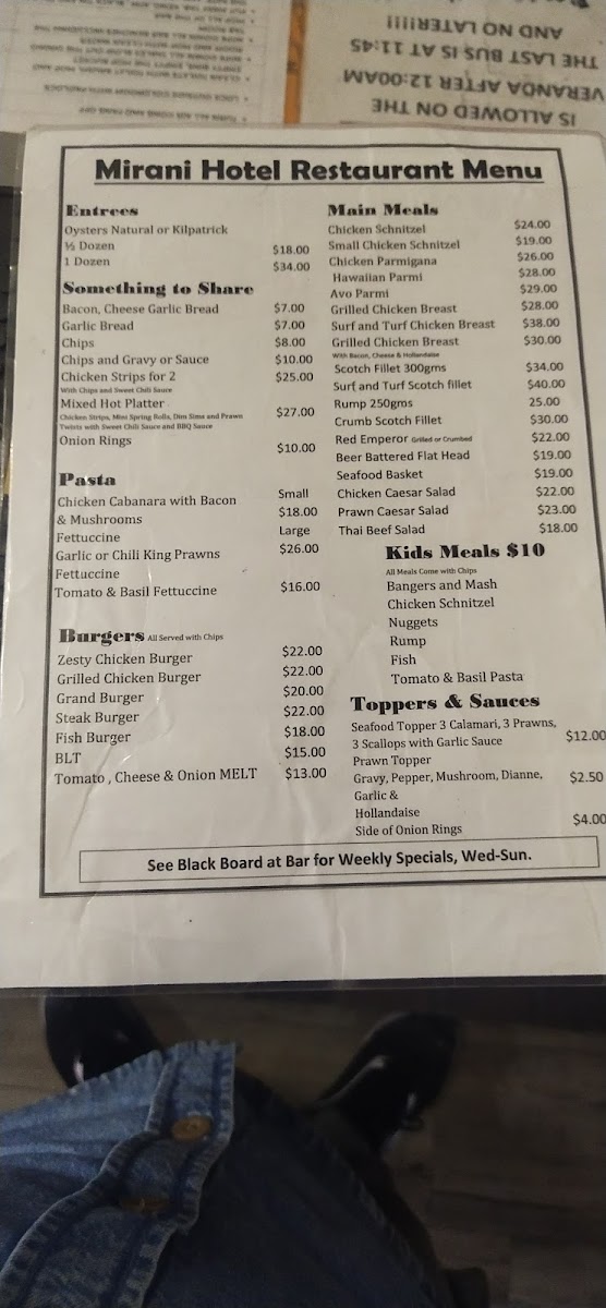 Mirani Hotel's restaurant menu offers a wide variety of flavorful dishes perfect for every taste and occasion. Starting with the Entrees, guests can enjoy Oysters Natural Or Kilpatrick, offering a fresh, oceanic start to the meal.